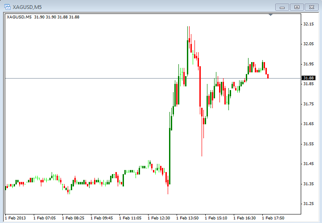 Let’s take a look at the charts of Gold and Silver to see what happened prior to and just after the release of these numbers. As of late Gold has been trading around the mid 1600 level and silver has been moving above and below the 32 level.