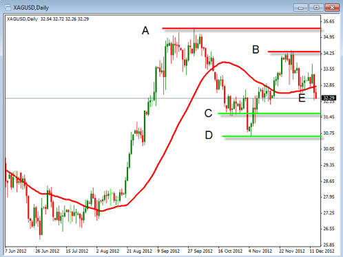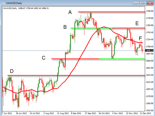 A= This is the past high point on the daily chart of gold. This area is important to identify because it is where there may be some long term resistance to price movement. This is common to identify in any chart we are looking at for both determining possible targets and where the price may stop moving.
