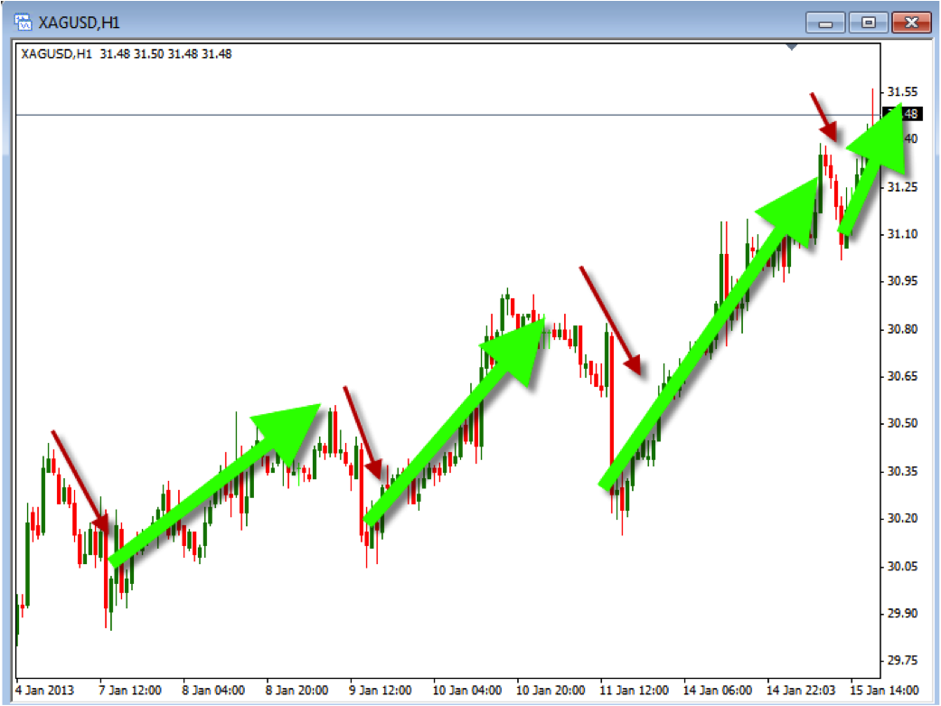Now take a look at the 1-hour chart of Silver and you can see a more deliberate pattern that it was making.  This deliberate pattern of higher highs (green arrows) and higher lows (red arrows) is what we want to see to trade.  These deliberate movements can give us confidence that we are trading during the right market conditions.