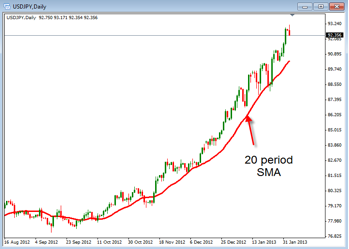 Take a look at this chart below which show a red line. This red line is the 20 period simple moving average and shows us where the average price currently is located. It also show you if the average price is getting higher or lower. This movement, up or down, is what we can look at to help us identify the trend of the chart we are trading. This chart is a daily chart of the USD/JPY.