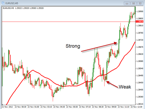 The next chart illustrates the trend by using a simple moving average with a period of 40.  Here you can see and easily identify the direction that things are moving.  An up trend would be in place if the simple moving average was going up and a down trend would be in place if the line is going down.  You can also use the location of the price to determine the strength of the trend.  If the line is going up and the price is above the line then the trend would be considered stronger than if the line was going up but the price was below the line. The reverse would be true for a down trend.  Take a look at the chart below to see both a strong up trend and a weak up trend.