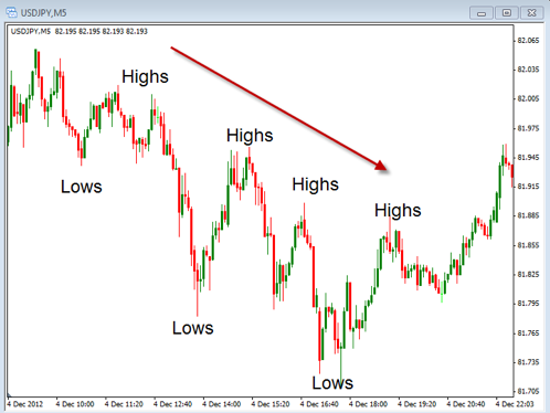 Notice that the action of price on the chart forms consecutive areas of lower lows and lower highs.  This situation provides us with the information needed to consider this as a down trending pair.  The opposite would be true if the prices were making higher highs and higher lows.  In this situation the trend would be considered up.  Regardless of what else you use on a chart to help you identify the trend you will always use price action to help confirm your conclusion as to whether or not the trend is up or down.